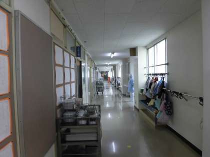 各クラスのおいしい給食を乗せたワゴンが廊下で待機中です。 -