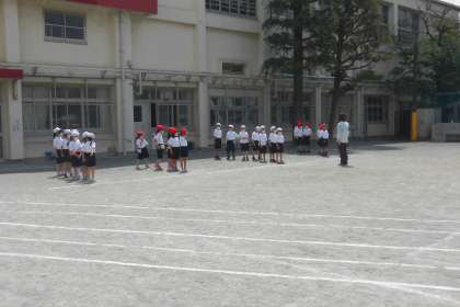 1年生は小学生になって、だんだん学校にもなれ、今日は校庭で元気に体を動かしていました。体育ではきちんと整列ができ、号令に合わせて全力疾走!