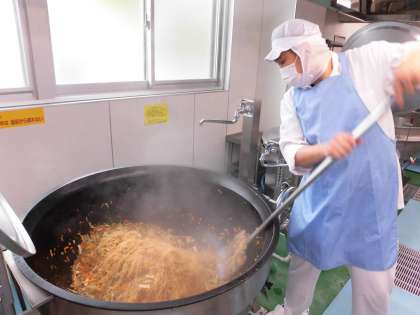 たくさんの焼きそばを炒めるのは体力がいるようです。 -