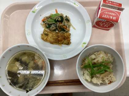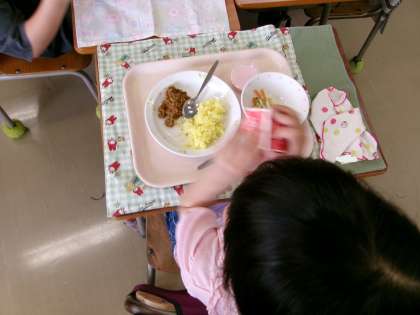 1年生ははじめての給食、みんなで協力して準備もできました。