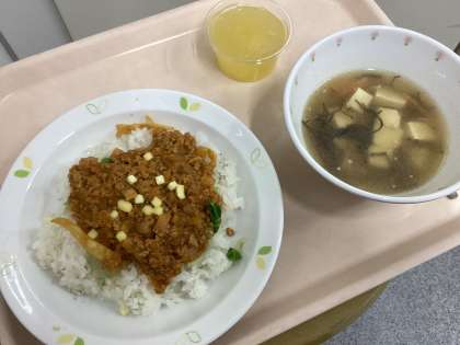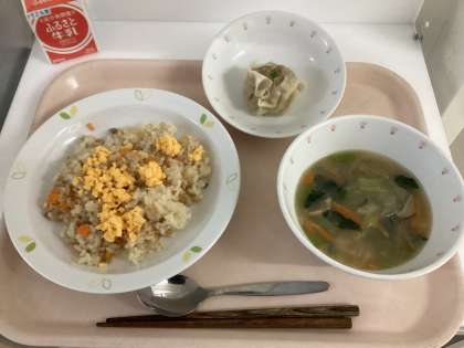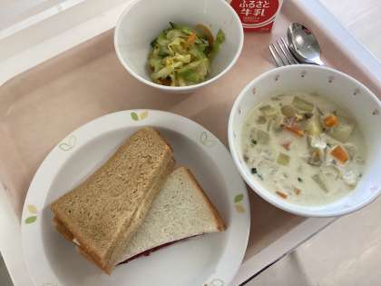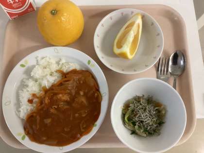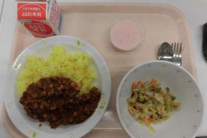 今日から1年生も給食を食べます。今日のメニューはキーマカレー・サラダ・イチゴのヨーグルトゼリー・牛乳です。1年生は、給食当番のやり方や、待ち方・お皿のもらい方などを担任から教えてもらい、はじめてとは思えないほど上手に役割を行いました。小学校はじめての給食を食べて、「おいしい!」と笑顔いっぱいでした。