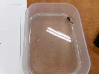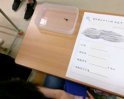 わかば学級C組では、おたまじゃくしの観察をしました。学校の池に住んでいるおたまじゃくしを入れ物に入れ、よく観察しました。色や形、大きさなどを様々な角度から見て、ワークシートに記録しました。足が出てきているのを見つけたり、下から見ると色が違う部分を見つけたり、様々なことに気付くことができました。