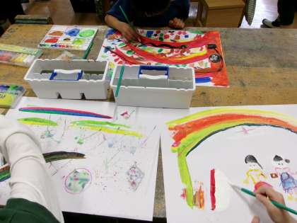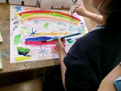 図工は3年生から、図工室で専科の教員に教わります。今日は、3年生は絵の具を使って自由に色を作り出したり、組み合わせたりする活動を行いました。様々な色づくりに挑戦したり、パステルカラーをきれいに組み合わせたりして、思い思いのデザインを描きました。次の時間から、絵の具を使って「夢の世界」を描くことに挑戦していきます。どんな世界が作り出されるのか、楽しみですね。