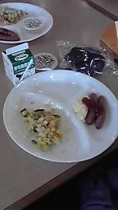 朝食のメニューです。ココアパン、ウインナー、スクランブルエッグ、サラダ、フルーツゼリー、牛乳です。