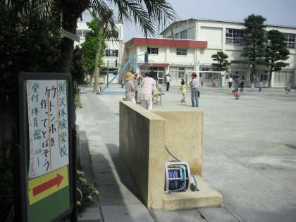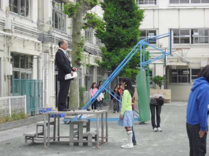 11時30分宿舎到着。同じ宿舎で生活する若林小学校との合同開園式をしました。二校の校旗が宿舎に翻りました。