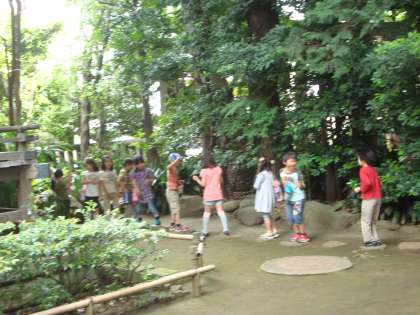 さわやかな朝の空気、鳥のさえずり、沢の音に囲まれての朝会。昨晩は、みんなよく眠れて体調万全。5分前行動もしっかりできました。