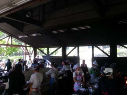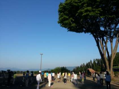 二日目も快晴です。早朝の青空と澄みきった空気の中で、朝の会を行いました。子どもたちからも「空気が美味しい。」「森の香りがする」などの声が聞こえました。鳥のさえずりと青々としたけやきの木の下で体をほぐした後、朝食をいただきました。