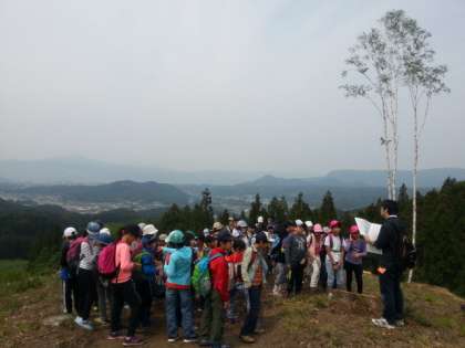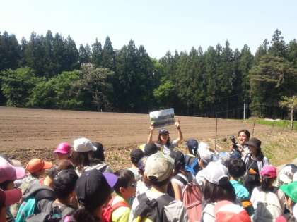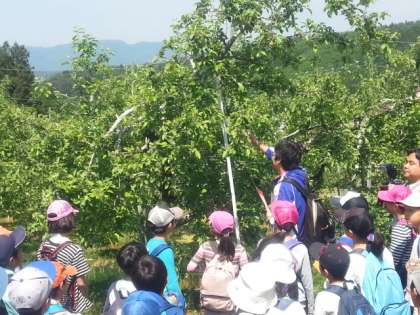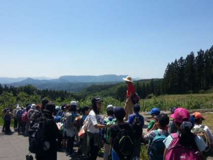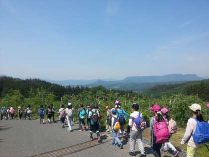里山めぐりに出発です。遠くの山を見下ろす場所から、里山についての学習をしながら、村役場方面へと、一気に下って行きます。補助員の先生方が、子どもたちに課題を出し、解説をしてくださいます。午前中のテーマは、農業と伝統です。りんごを育てる工夫、観光とりんごづくり、稲づくりやこんにゃく芋の栽培の変遷、村を守り発展を願う伝統芸能や文化などについて学びました。
