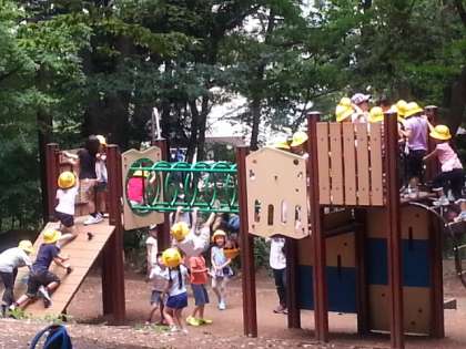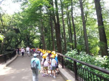 1・2年生が、林試の森に遠足に行きました。1年生と2年生が一つのグループを作って行動しました。たくさんの人数での行動もスムーズにできました。広場は、遊び方を工夫したり、ルールを話し合って鬼遊びをしたりする元気な姿であふれていました。 -
