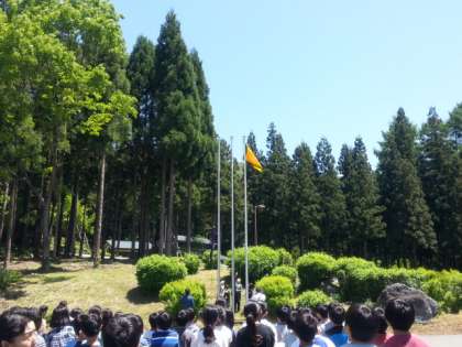 今日から3日間、5年生が移動教室に行きます。午前中は、川場村歴史民俗資料館で、村の歴史を学びました。宿舎に着いて、同宿する希望が丘小学校の皆さんと、開室式を行いました。雲ひとつない青空と、青葉の香りが、子どもたちを迎えてくれました。