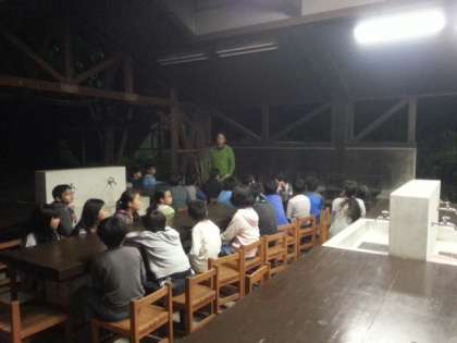 里山の概要をつかんだ後は、飯盒炊さんです。グループで、協力して調理をします。ご飯を炊き、カレーを作って、美味しくいただいました。夜になり、ナイトハイクをしました。専門スタッフの方に、次第に暮れゆく里山を案内していただきました。今日は月の光りもあり、自然界の暗さと、月の明るさにビックリしました。耳を澄ますと、遠くの里の田んぼから、蛙の声が聞こえて来ました。最後に、明るい蛍光灯の下で、スタッフの方から、里山での生活の様子や動物とのふれ合い、冬の静かさなどについてのお話をうかがいました。
