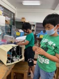 紙けん玉に自分たちのアイディアを加え、さらに楽しくパワーアップしました。 -