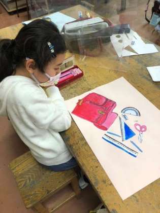 ランドセルの絵を、文房具などの絵と共にコラージュして作品を仕上げています。