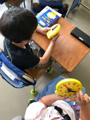 ブロックやおはじき、模擬時計などを使って、数や時間の学習をしています。ゲームなども取り入れながら、手を動かして、目で見て、数や数量の感覚を身に付けていきます。