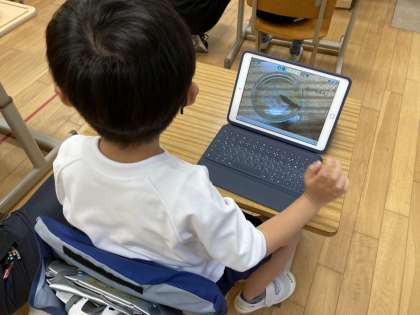タブレットでヤゴを撮影し、足の数や形、感触など観察して気づいたことを書き込みました。