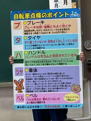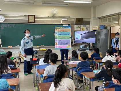 警察の方に、自転車の安全な乗り方や自転車点検の仕方を教えていただきました。ビデオ視聴では事故が起きやすい場面を知り、怖いな、気をつけようと、真剣に見入っていました。