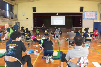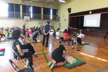 「傷病者の胸の厚さが15cm以下の場合」の心臓マッサージのやり方など、小学生に合わせた内容の濃い講習でした。 -