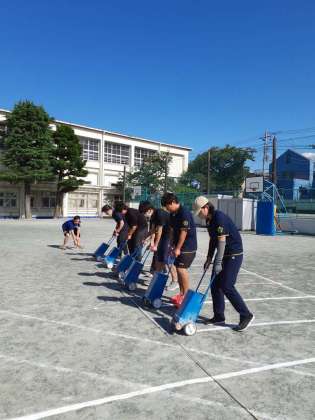 いよいよ明日は体力テストです。ソフトボール投げの準備で、1m間隔の線を校庭に引きました。