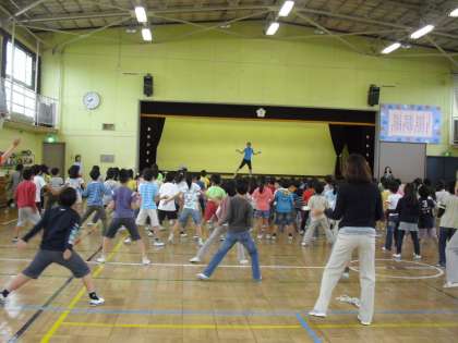 子どもたちはステージ上の先生の動きをまねながら、楽しく体を動かしていました。