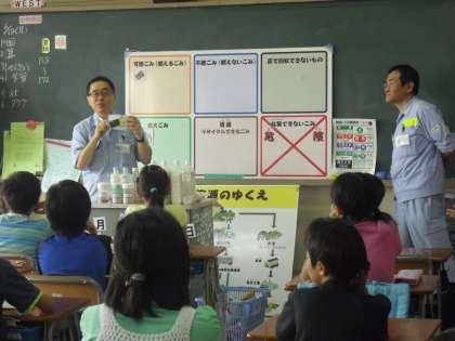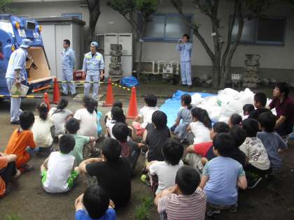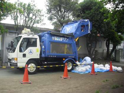 実際に、ゴミの袋を収集車に入れる体験をしたり、ゴミの分別、収集する曜日、アルミ缶など回収したゴミのゆくえについて、子どもたちは興味深く話を聞いたりしました。