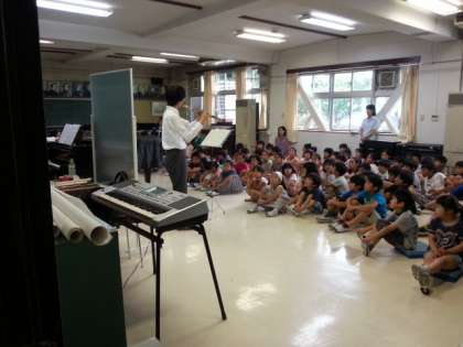 フルート奏者の方をお招きし、美しい演奏を聞かせていただきました。たくさんの児童が、始めて近くで聞く音に集中して聞き入っていました。わかば・つくし学級の児童は、フルートやフルートに似た色々な楽器に触れ、その重さや音色の違いに気付き、たくさんの発見をしました。