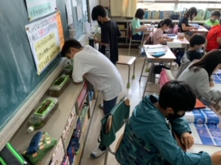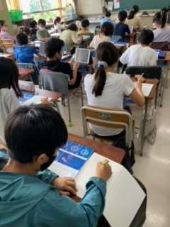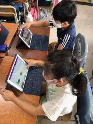 ?「魚のたんじょう」では、メダカのたまごの成長を学習しています。今日は、メダカの受精卵の変化をまとめ、iPadのQubenaを使って問題を解き、学習を深めています。