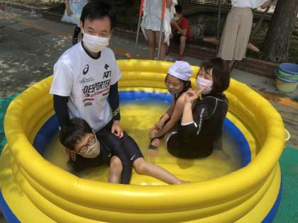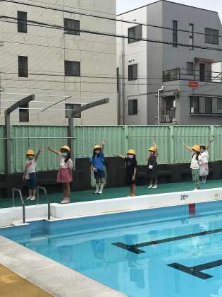 着替えの練習もしました。みんなが安心して着替えるためのマナーについても学習しました。タオルを巻いて、下を脱いだら下を履く。上を脱いだら上を着る。水着を脱ぐときはその逆です。家でも是非練習してほしいと思います。 -