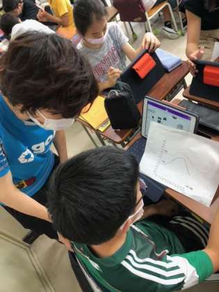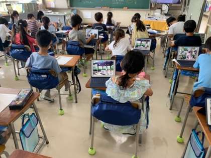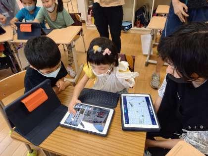 奥沢小の西側探検チームと東側探検チームでペアになり、見つけてきた場所をタブレットを使って伝えあいました。