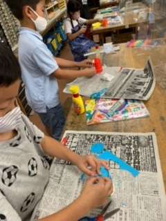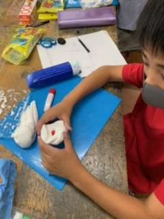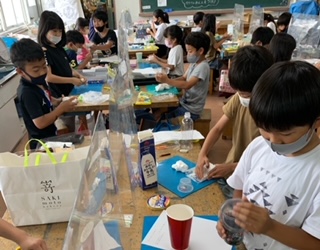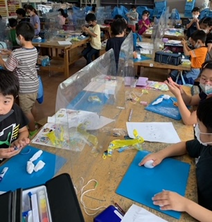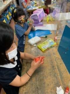 「くっつきマスコット」では、紙粘土と磁石を使って、くっつくマスコットを作ります。白い紙粘土に、絵の具を混ぜ込んで、好きな色の紙粘土をつくります。絵の具を混ぜ込むと、だんだんと色が変わっていく紙粘土が面白かったようです。あちこちで、「先生!見て!!こんな色が出来ました!」と喜びの声があがっていました。