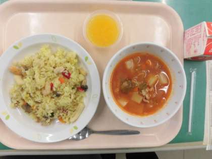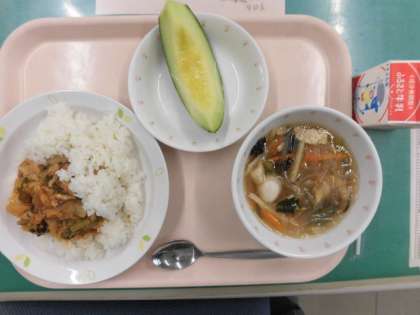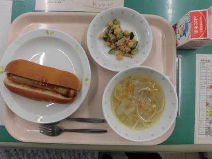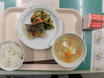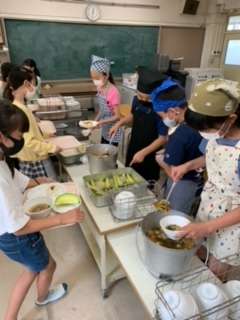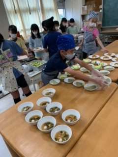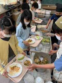 給食当番はエプロンと三角巾をつけて配膳します。最初にある程度の数をよそって、配膳の用意をします。受け渡しも、落ち着いた態度です。