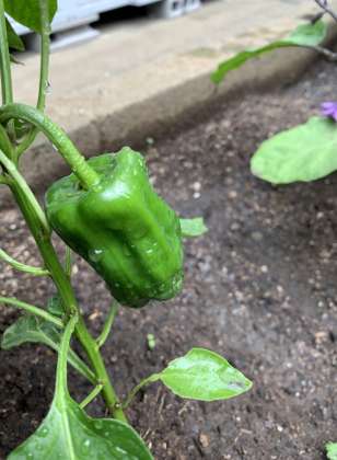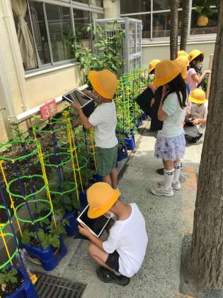 タブレットで写真を撮り、野菜の成長を記録しています。