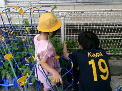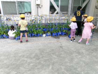 1年生は、アサガオを育てています。だんだんとつるが伸びてきました。水やりなどのお世話を一生懸命がんばっています。