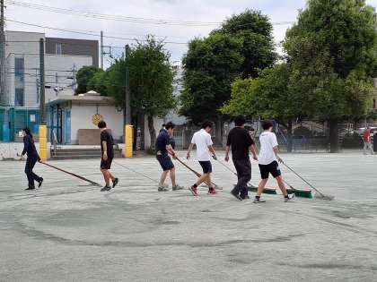 校庭の砂が少なくなっていたので、職員が砂の補充をしました。補充をした後には、グラウンドをきれいに均しました。