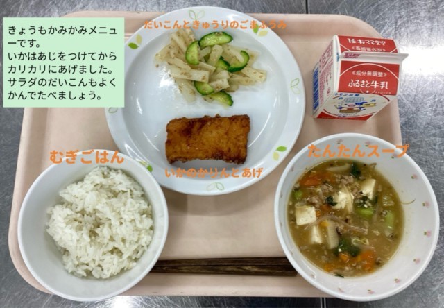 今日もかみかみメニューです。いかは下味をつけて、でんぷんでカリカリになるように揚げました。
