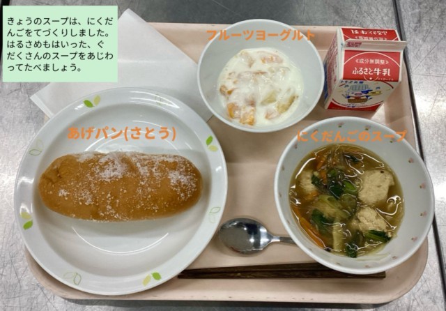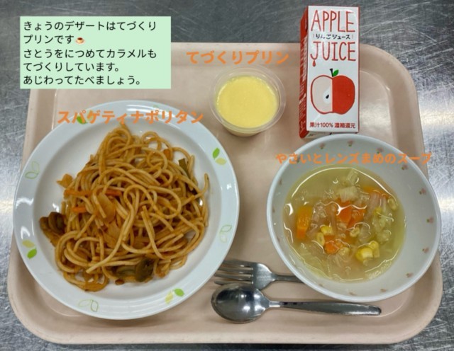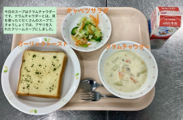 給食では、あさりやたまねぎ、コーンやじゃがいもを使ったクリームスープにしました。