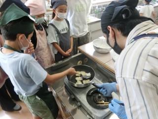 しっかり説明を聞き、調理スタート。同じ班の保護者の方や大学生ボランティアに教わりながら、丁寧に大根やベーコンを切ったり、混ぜたりしていよいよ焼き始めるととてもいいにおいです。初めて包丁を握った、フライパンや鍋でお湯を沸かしたのも初めてという児童がたくさんいました。