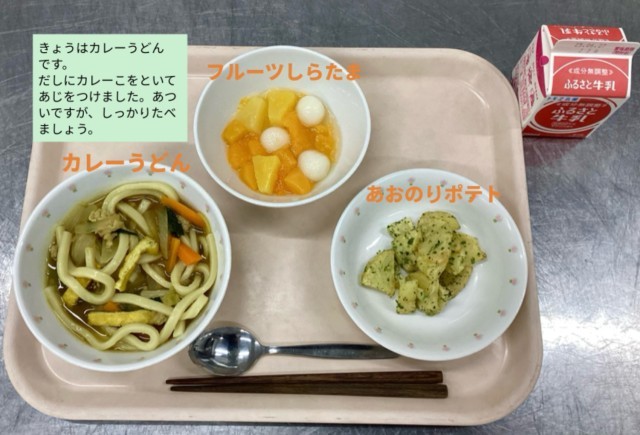 今日はカレーうどんです。だしで豚肉やたまねぎ、油揚げなどを煮込んでから、