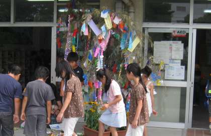 玄関には1年生が作った七夕飾りが飾られています。子どもたちの七夕に託す思いがたくさん書かれていますので、お読みください。 -
