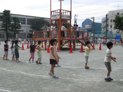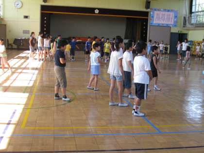 7月16日(木)8時半から10分間でしたが、月1回の地域班遊びがありました。6年生や5年生の班長さんを中心に地域班ごとに遊びました。やはりドッジボールをやる班が多かったのですが、ふやしおにや大なわ、的あてなどをやる班もありました。今日も朝から暑かったのですが、顔を真っ赤にしながら、みんなで楽しんでいました。