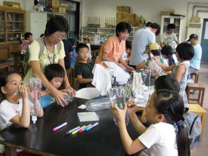 1年生、2年生、3年生〜6年生に分かれて作りました。1年生は飾り付けを中心に作りました。2年生ははねをつけたり、二連にしたり、少し飾りつけもしました。3年生〜6年生は大きなペットボトルを使い、連結させて作りました。