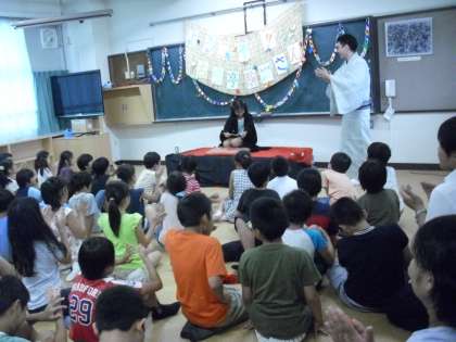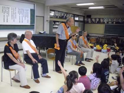 駒次さんと一緒に、4年生は「じゅげむ」をいろいろな速さで朗唱しました。