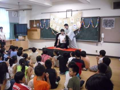 それから、扇子を箸に見立てて、そばやうどんをすする動作をやってみました。代表児童2名と先生が、みんなの前でやってみせ、拍手をもらいました。