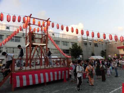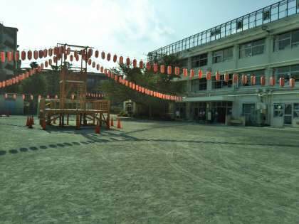 奥沢小学校の校庭は、盆踊り大会の準備でやぐらが立っています。