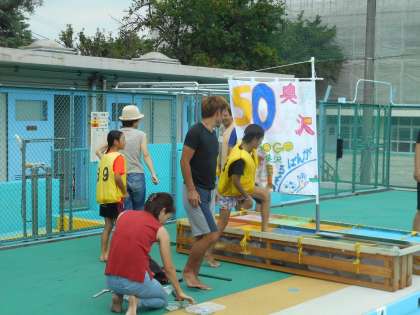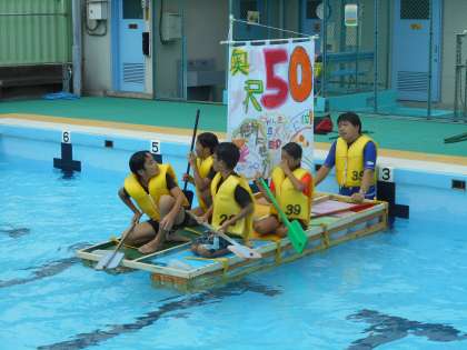 昨日8月28日(日)に実施予定であった「アドベンチャー in 多摩川 いかだ下り大会」は、台風の影響で川が増水したために、残念ながら中止となりました。本校では、今年度いかだ1艇をエントリーし、出艇予定でした。いかだの名は、「GO!GO!奥沢EKD」号、5年男子3名、4年女子1名の児童4名と教員1名が乗り手でした。本番の様子がお伝えできない代わりに、8月13日(土)進水式と練習会を本校のプールで行った写真を掲載しましたので、ご覧ください。