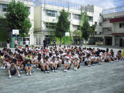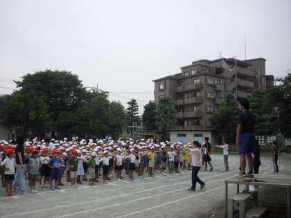 朝から強い日差しが照りつける校庭で、2学期最初の全校朝会が行われました。
