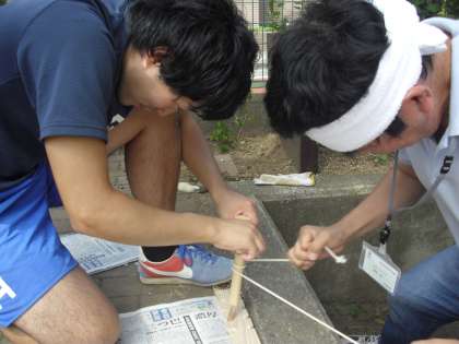 前半は、はずみ車を使っての火おこしです。はずみ車を上手に回転させて摩擦熱で火をおこすやり方です。どのグループもはじめのうちは、はずみ車を回転させることができず大変でしたがこつをつかむと木を焦がすことができました。