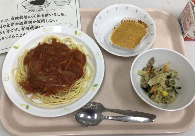今日の給食は、アマトリチャーナスパゲティ、野菜ソテー、キャロットケーキ、牛乳です。