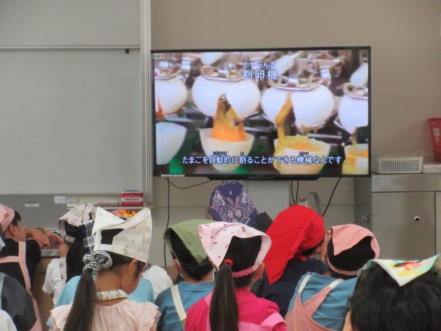 マヨネーズの材料や工場での工程を動画で確認し、グループでいざ挑戦!