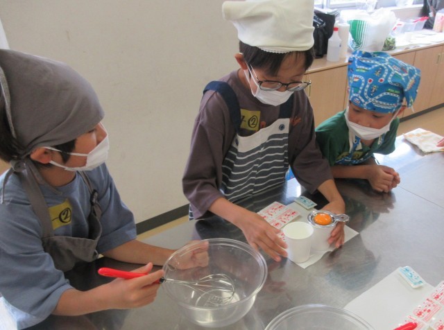 たまごを割って黄身だけを取り出したり、材料を交代で混ぜたり。