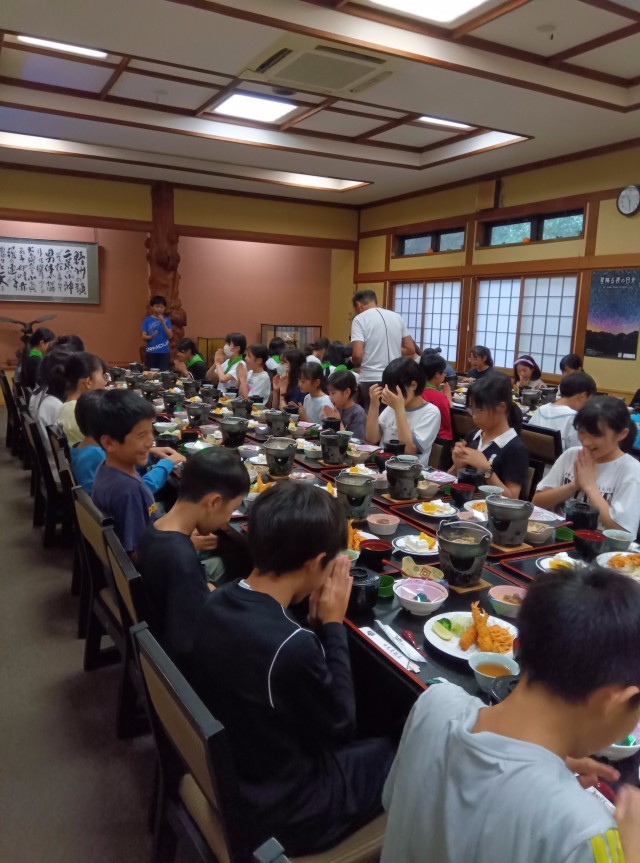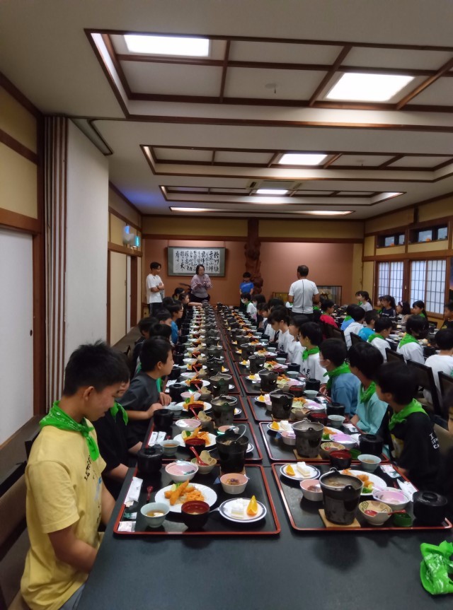 一日目の夕食です。宿に着いてから初めての食事です。日光の特産品の一つ「刺身湯葉」も出していただき、1日の疲れが吹き飛ぶと共に、キャンプファイヤーに向けての英気を養うことができました。夜のイベント、キャンプファイヤーも盛り上がっていきます!!